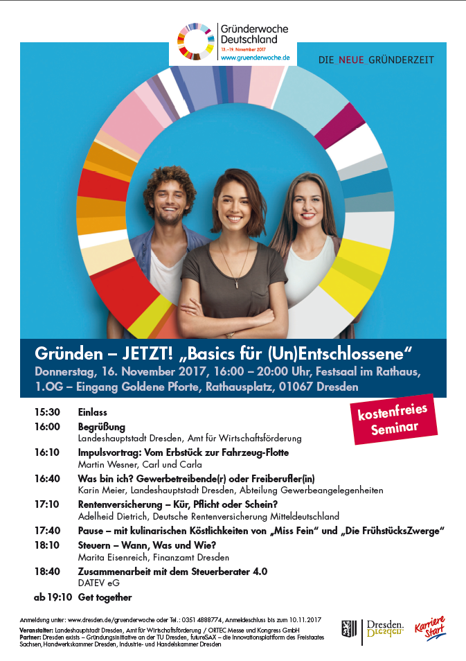 Im Rahmen der Gründerwoche Deutschland (13. bis 19. November) laden das Amt für Wirtschaftsförderung Dresden und die KarriereStart am 16. November gemeinsam mit Dresden exists – Gründungsinitiative an der TU Dresden, futureSAX – die Innovationsplattform des Freistaates Sachsen, Handwerkskammer Dresden, Industrie- und Handelskammer Dresden zum kostenfreien Gründerseminar in den Festsaal des Dresdner Rathauses ein. Der Einlass erfolgt 15.30 Uhr, die Veranstaltung endet um 20.00 Uhr. Unter der Überschrift "Gründen - JETZT! 'Basics für (Un)Entschlossene'" befassen sich die Vorträge unter anderem mit den Themen Gewerbeangelegenheiten, Rentenversicherung und Steuerfragen. Ab 19.10 Uhr finden sich die Teilnehmer zum "Get Together" zusammen. Anbei finden Sie das komplette Seminarprogramm zur Ansicht und zum Download.